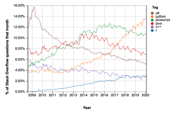 Phython’ın başarısı her bir gönderideki etiketleri (tag) sayan Stack Overflow eğilimlerine de yansımakta. Stack Overflow’un boyutu göz önüne alındığında bu, bir dilin popülerliğini ölçmek için oldukça iyi bir veri.