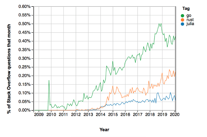 Piyasada başka diller mevcut olsa da, Pyhton’un zayıf ve eksik yönlerini gideren diller Rust, Go ve Julia’dır. Bu dillerin hepsi gelişmekte olan (yet-to-come) teknolojiler konusunda ve bilhassa yapay zekada mükemmeldirler. StackOverflow etiket sayılarında da pazar payları küçük görünse de, hepsinin eğilimi yukarı doğrudur.